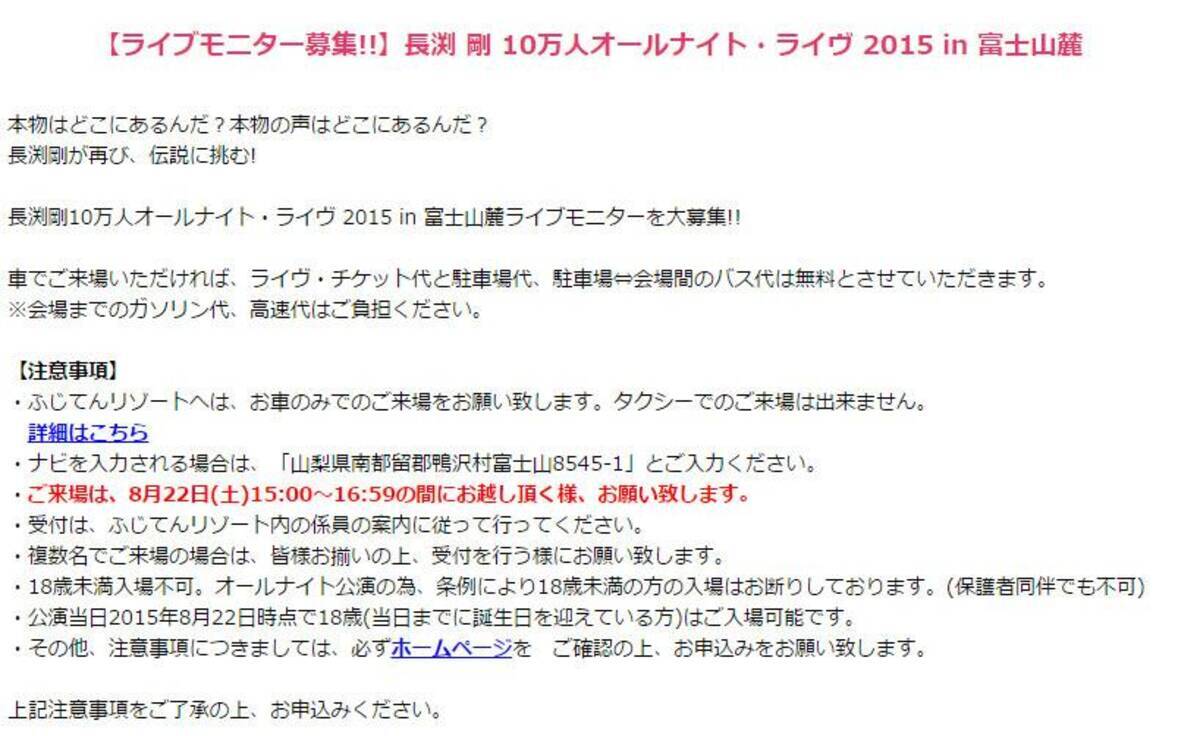 長渕剛 10万人オールナイト ライヴ イープラスでチケット代 駐車場代 バス代無料のライブモニター募集も 15年8月22日 エキサイトニュース